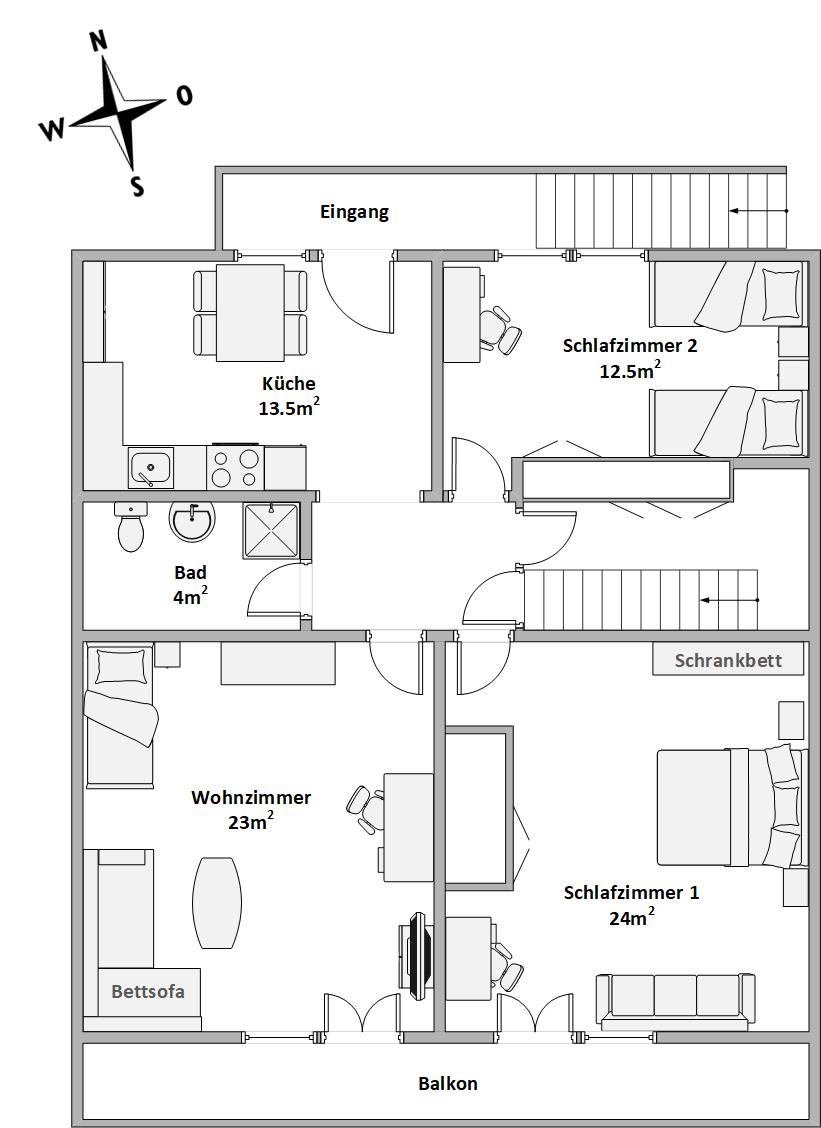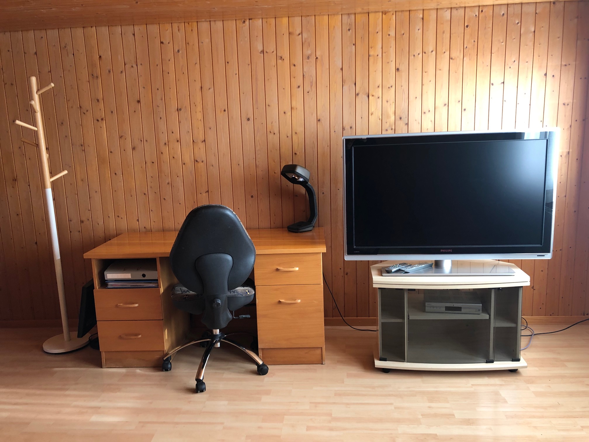 The living room with direct access to the balcony contains a 1 single bed, a bed sofa, desk and TV (satellite).