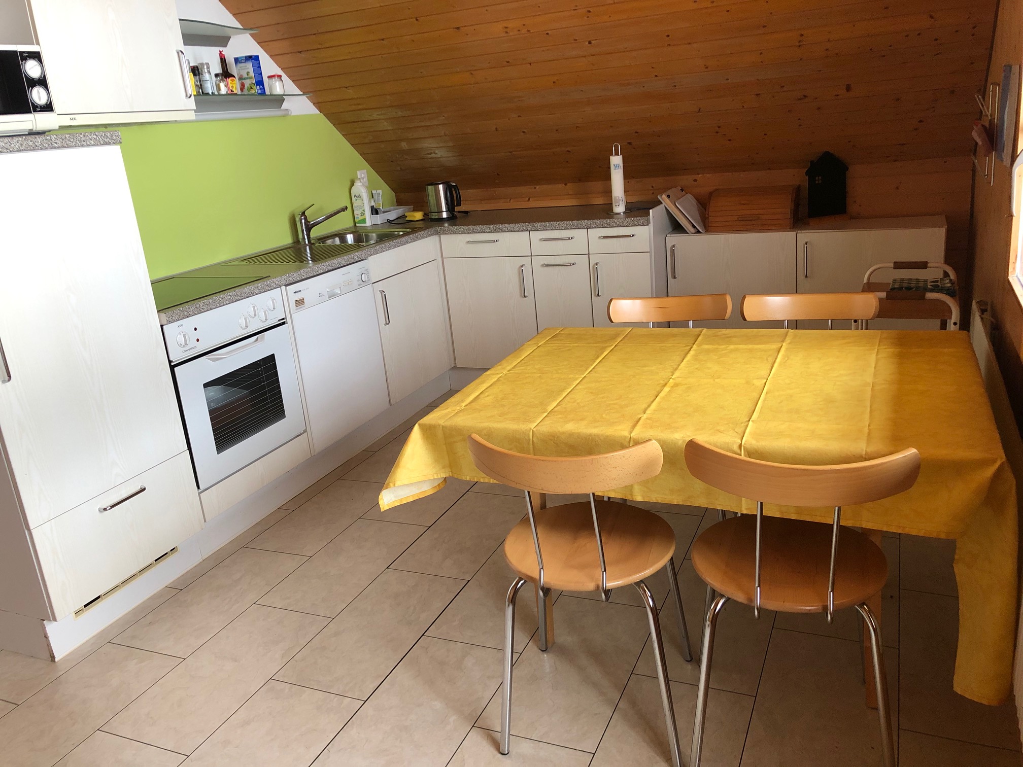 The spacious kitchen is well equipped and contains a dining table.