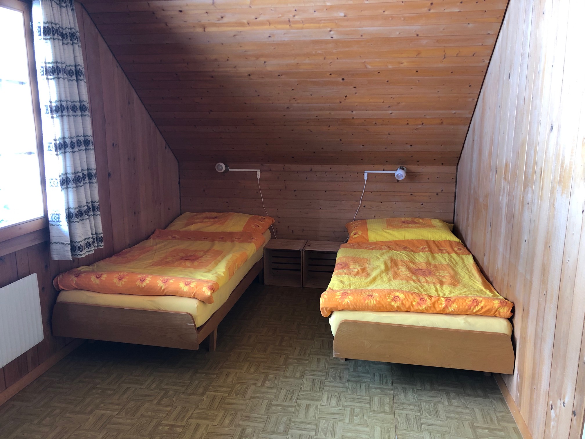The second bedroom contains 2 single beds and a desk.