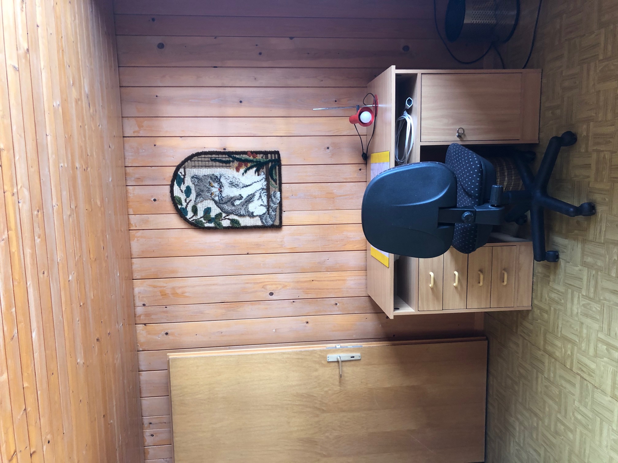 The master bedroom with direct access to the balcony contains a double bed, an extra bed (a bed for children is available as well), desk and cupboard.